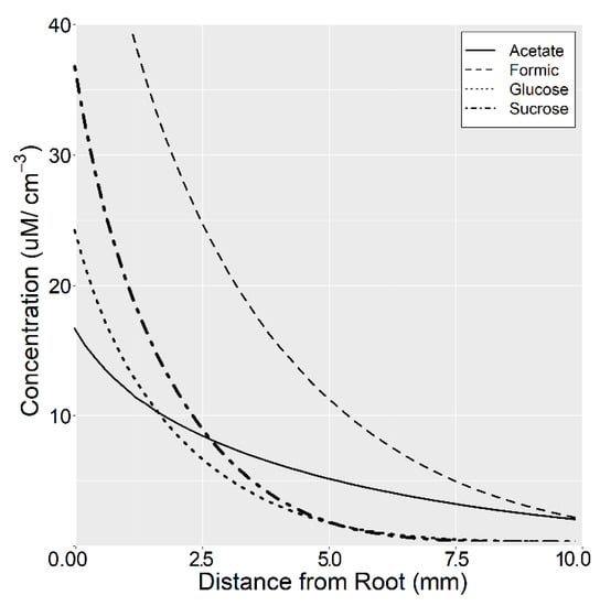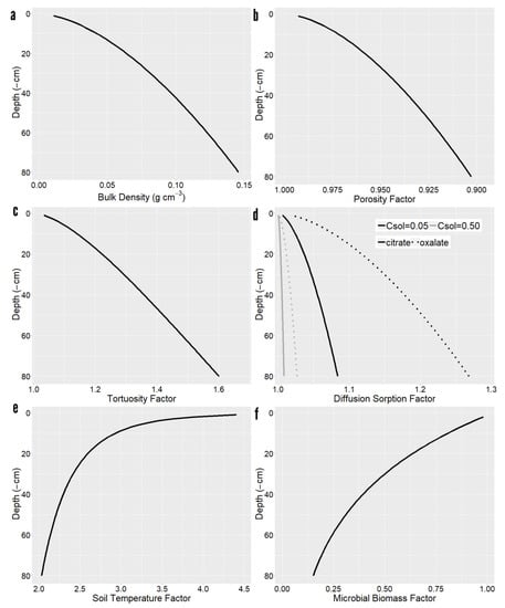 - Raynaud, X. Soil properties are key determinants for the development of exudate gradients in a rhizosphere simulation model. Soil Biol. Biochem. 2010, 42, 210–219. [Google Scholar] [CrossRef]