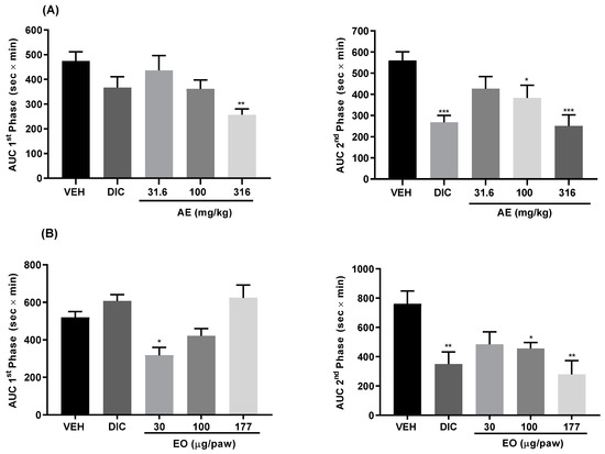 Antinociceptive effect of an aqueous extract (31.6−316 mg/kg) and an essential oil (30−177 µg/paw) from B. heterophylla in the formalin test in mice. (A) AUC from the time course curve of phase 1 and AUC from the time course curve of phase 2. VEH: vehicle (0.9% saline solution). DIC (50 mg/kg, p.o.). (B) AUC from the time course curve of phase 1 and AUC from the time course curve of phase 2. VEH: vehicle (0.9% saline solution). DIC: (100 µg/paw, i.pl.). Each measurement represents the mean ± SEM 6 mice per group. Significantly different from VEH group (* p < 0.05, ** p < 0.01, *** p < 0.001) determined by ANOVA followed by Dunnett’s post hoc test.