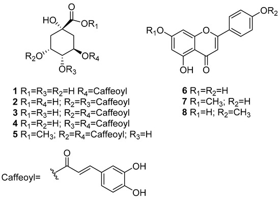 Chemical investigation of the aqueous extract afforded eight known compounds (Figure 2), identified as chlorogenic acid (1) [16], 3,4-di-O-(E)-caffeoylquinic acid (2) [17], 3,5-di-O-(E)-caffeoylquinic acid (3) [16,17,18], 4,5-di-O-(E)-caffeoylquinic acid (4) [16,17,18], 3,5-di-O-(E)-caffeoylquinic acid methyl ester (5) [17], apigenin (6) [19], genkwanin (7) [17], and acacetin (8) [20]. The structures of the known compounds were identified by comparing their spectroscopic and spectrometric data with those previously reported or by comparison with authentic samples (Tables S1 and S2, Supplementary Materials). Compounds 1–5 and 8 are reported for the first time in this species.