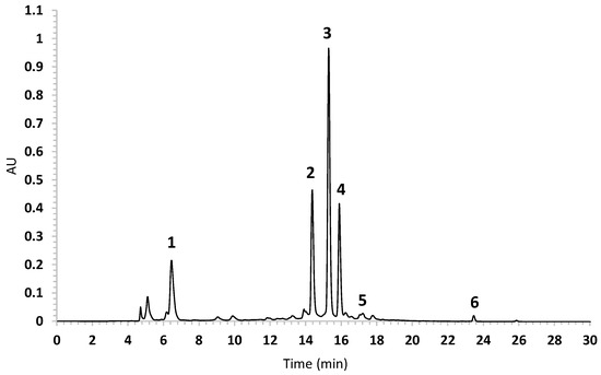 HPLC-PDA chromatogram of B. heterophylla aqueous extract under optimized conditions; detection wavelength at 327 nm. Peak identification: 1: RT 6 min; 2: RT 14.6 min; 3: RT 15.6 min; 4: RT 16.2 min; 5: RT 17.2 min; 6: RT 23.6 min.