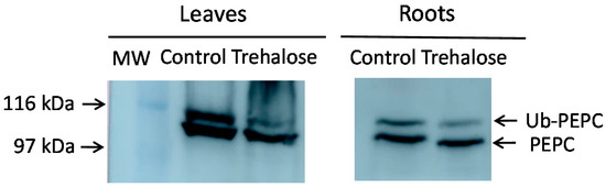 Monoubiquitinated PEPC (p110) shows lower mobility in acrylamide gels than non-monoubiquitinated PEPC (p107). This allows the identification of monoubiquitinated PEPC in gels and immunoblots as the upper band of immunoreactive PEPC protein. When trehalose was supplied to Arabidopsis plants, this decreased the monoubiquitination of PEPC in the leaves and roots (Figure 1). Although trehalose has not been demonstrated to trigger autophagy in Arabidopsis, this result prompted us to investigate the link between autophagy and monoubiquitination of PEPC.