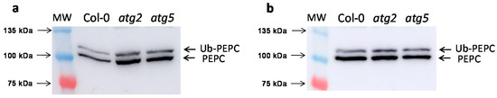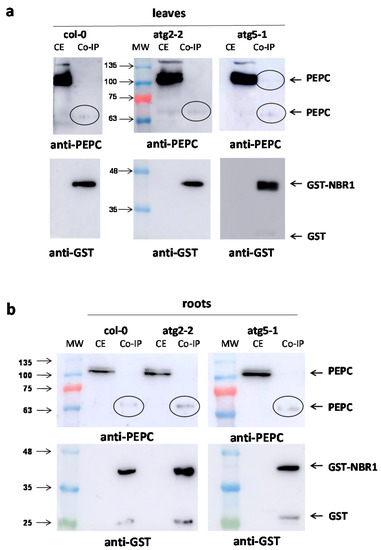 Pull-down experiments were performed with leaves (Figure 7a) and roots (Figure 7b) of Arabidopsis lines Col-0, atg2-2, and atg5-1. Anti-PEPC antibodies revealed a 65 kDa peptide that interacted with GST-NBR1 in leaves and roots extracts from all the lines. In addition, a 100 kDa anti-PEPC immunoreactive peptide was observed in the leaves of the atg5-1 line. The amounts of co-immunoprecipitated PEPCs were slightly higher in the autophagy-deficient lines.