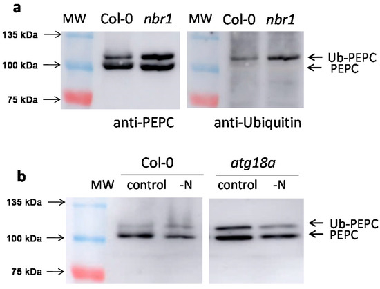 Similar results were obtained with the leaves and roots of nbr1 (Figure 3a) and atg18a lines (Figure 3b). In nbr1 leaves, the accumulation of monoubiquitinated PEPC was especially evident (Figure 3a, left), represented by the upper band, which was revealed by anti-ubiquitin antibodies (Figure 3a, right). Increased p110/p107 ratios were detected to different extents in all the defective autophagy lines (Table 1).