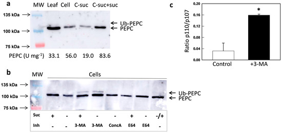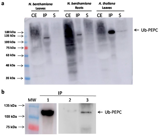 The next step was to confirm that the p110 band corresponded to the monoubiquitination of p100. PEPC present in crude extracts from different sources was immunoprecipitated by incubation with anti-PEPC antibodies [51]. Anti-ubiquitin antibodies exclusively revealed the p110 band in the precipitate from N. benthamiana leaves and roots, as well as A. thaliana leaves (Figure 6a). Similar results were obtained with N. benthamiana cells (Figure 6b) when 3-MA was added to the growing medium (lane 3). In the absence of 3-MA, the amount of monoubiquitinated PEPC was barely noticeable (lane 2). This result demonstrates that the upper band effectively corresponds to an ubiquitinated form of PEPC, and that the amount of monoubiquitinated PEPC was increased when the formation of autophagosomes was blocked.