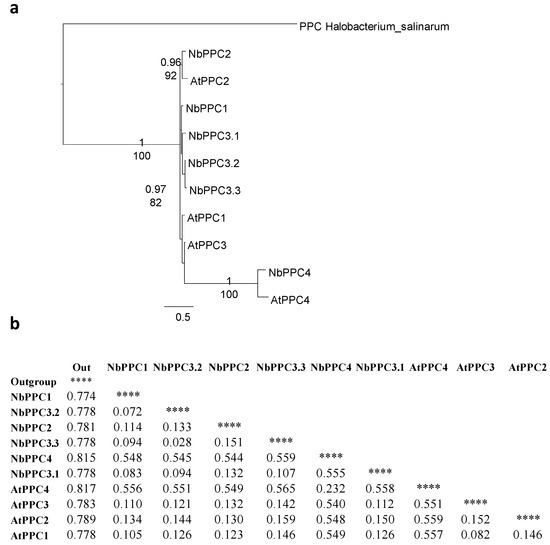 Phylogenetic analysis of N. benthamiana PEPCs. (a) Phylogeny of phosphoenolpyruvate carboxylase (PPC) proteins and their isoforms in N. benthamiana and A. thaliana. For protein identification, “Nb” indicates N. benthamiana proteins and “At” indicates A. thaliana proteins. As outgroup was used a PEPC from Halobacterium salinarum (HsPPC). Bootstrap analysis was carried out with 100 replicates. Number at the branches correspond to the bootstrap frequencies for each branch. (b) Evolutionary divergence matrix estimated from PEPCs proteins sequences. The rate variation among sites was modeled with a gamma distribution (shape parameter = 1). **** means “not applicable”.