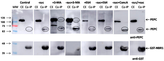 The pull-down experiments with truncated GST-NBR1 in N. benthamiana cells extracts obtained different results in different conditions. Experiments were conducted with the control, without sucrose and/or in presence of the inhibitors 3-MA, E64, and ConcA (Figure 8). Anti-PEPC antibodies revealed a 65 kDa peptide in the pull-down in all the experiments. In addition, in the presence of 3-MA, an intact 100 kDa peptide was also detected.