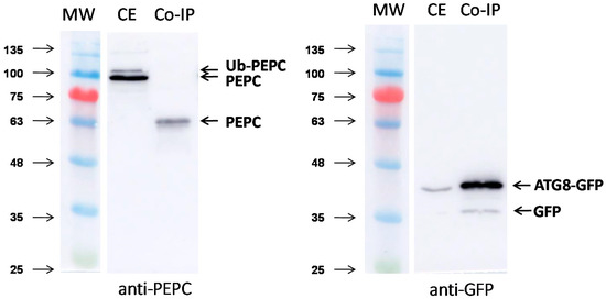 Co-immunoprecipitation of PEPC with GFP-ATG8CL in N. benthamiana. A transformed Agrobacterium tumefaciens strain GV3101 line carrying potato ATG8CL fused to green fluorescent protein (GFP) has infiltrated N. benthamiana. At 60 h after agroinfiltration, proteins were extracted from infiltrated leaves using a 2 mL GTEN buffer per g of tissue. Crude extracts were incubated with GFP-Trap®_A (Chromotek) for 2 h at 4 °C. Then, extracts were centrifuged at 1000 g for 2 min at 4 °C, washed five times, and co-precipitated proteins were eluted by heating at 95 °C for 5 min with a dissociation buffer. Afterwards, 15 μL of the crude extracts (CE) and co-precipitated proteins (Co-IP) were immunoblotted with the anti-PEPC (left) and anti-GFP (right) antibodies.