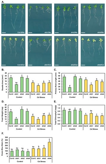 The phenotypic and physiological responses of the Arabidopsis lines Col-0, drb1, drb2 and drb4 to cadmium stress. (A) The phenotypes displayed by 15-day-old control (top panels) and Cd-stressed (bottom panels) Col-0, drb1, drb2 and drb4 plants. Bar = 1.0 cm. Quantification of the phenotypic parameters, (B) rosette area (mm2), (C) primary root length (mm) and (D) whole seedling fresh weight (mg), of 15-day-old Cd-stressed Col-0, drb1, drb2 and drb4 seedlings compared to those of the control grown counterpart of each plant line. Determination of the physiological parameters, (E) total chlorophyll content (mg/g FW) and the (F) degree of cell membrane damage (presented as a percentage (%) of the absorbance of the Col-0/Ns sample at wavelength 600 nm), as determined by spectrophotometry of control and Cd-stressed Col-0, drb1, drb2 and drb4 seedlings. (B–F) Statistical data were analyzed using one-way ANOVA and Tukey’s post-hoc tests. The statistically significant differences are indicated by a different letter (p-value < 0.05) above each column of each histogram.