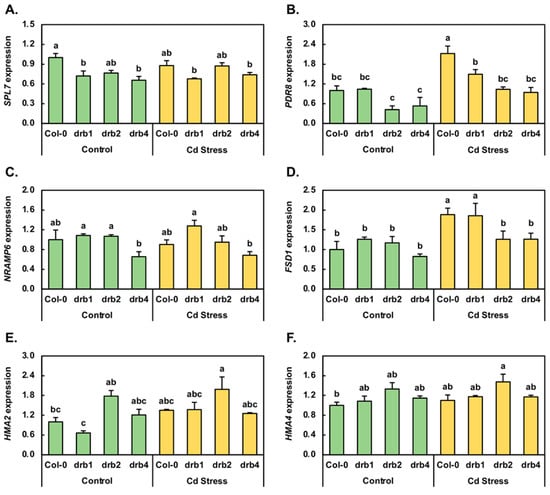 RT-qPCR quantification of the expression of Arabidopsis genes known to be responsive to cadmium stress. A standard RT-qPCR approach was used to quantify the transcript abundance of a select group of Arabidopsis genes known to be responsive to Cd stress, including (A) Squamosa promoter binding protein-like 7 (SPL7); (B) PDR8; (C) natural resistance-associated macrophage protein (NRAMP6); (D) FE superoxide dismutase 1 (FSD1); (E) heavy metal ATPase 2 (HMA2) and (F) heavy metal ATPase 4 (HMA4). The expression of these six genes was analyzed in 15-day-old Col-0, drb1, drb2 and drb4 plants following their exposure to a 7-day 50 μM CdCl2 stress treatment regime for comparison to the control grown counterpart of each Arabidopsis line. (A–F) Statistical data were analyzed using one-way ANOVA and Tukey’s post-hoc tests. The statistically significant differences are indicated by a different letter (p-value < 0.05) above each column of each histogram.