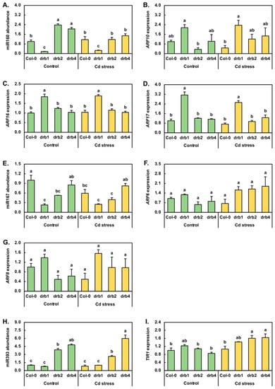 Molecular profiling of the expression modules of three auxin pathway-specific microRNAs following the exposure of Col-0, drb1, drb2 and drb4 plants to cadmium stress. RT-qPCR quantification of miR160 abundance (A) and the expression of its target genes, ARF10 (B), ARF16 (C) and ARF17 (D), in 15-day-old control and Cd-stressed Col-0, drb1, drb2 and drb4 plants. RT-qPCR quantification of miR167 abundance (E) and of the expression of its ARF target genes, ARF6 (F) and ARF8 (G), in 15-day-old control and Cd-stressed Col-0, drb1, drb2 and drb4 plants. Profiling of miR393 abundance (H) and of the expression of its primary target gene, TIR1 (I), in control and Cd-stressed Col-0, drb1, drb2 and drb4 whole seedlings by RT-qPCR. (A–I) Statistical data were analyzed using one-way ANOVA and Tukey’s post-hoc tests. The statistically significant differences are indicated by a different letter (p-value < 0.05) above each column of each histogram.