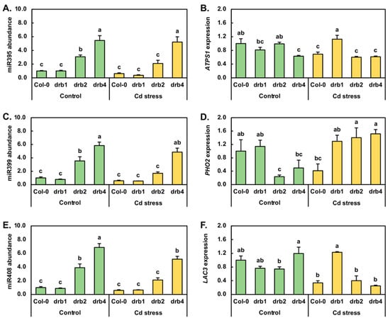 RT-qPCR quantification of the abundance of three Arabidopsis abiotic stress responsive microRNAs and the expression of their target genes in cadmium-stressed Col-0, drb1, drb2 and drb4 seedlings. RT-qPCR assessment of miR395 abundance (A) and the expression of its target gene, ATPS1 (B), in control and Cd-stressed Col-0, drb1, drb2 and drb4 whole seedlings. Quantification of the abundance of miR399 (C) and the expression of its target gene PHO2 (D) in Col-0, drb1, drb2 and drb4 whole seedlings cultivated in either control conditions or a Cd-stress environment. RT-qPCR analysis of miR408 abundance (E) and the expression of its target gene, LAC3 (F), in 15-day-old control and Cd-stressed Col-0, drb1, drb2 and drb4 whole seedlings. (A–F) Statistical data were analyzed using one-way ANOVA and Tukey’s post-hoc tests. The statistically significant differences are indicated by a different letter (p-value < 0.05) above each column of each histogram.