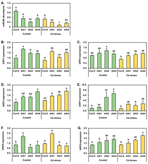 RT-qPCR quantification of the miR396 abundance and GRF target gene expression in control and cadmium-stressed Col-0, drb1, drb2 and drb4 plants. Quantification of miR396 abundance (A) and the expression of its GRF target genes, GRF1 (B), GRF2 (C), GRF3 (D), GRF7 (E), GRF8 (F) and GRF9 (G), via RT-qPCR assessment of 15-day-old control and Cd-stressed Col-0, drb1, drb2 and drb4 whole seedlings. (A–G) Statistical data were analyzed using one-way ANOVA and Tukey’s post-hoc tests. The statistically significant differences are indicated by a different letter (p-value < 0.05) above each column of each histogram.