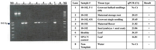 In 2016, a total of 3428 seedlings of 20 different sweet potato maternal genotypes were germinated in open bench soil beds in a greenhouse. Fifteen of the 20 maternal genotypes tested positive for SPLCV (Table 1). The average germination rate for each genotype was 79.4%. Six weeks post germination, seedlings in approximately the 4-5 true leaf stage were visually observed for disease-like symptoms. Determination for the presence of SPLCV was based on real-time PCR testing using 70 bulked leaf samples. All bulked samples tested negative for SPLCV (Table 1). The Ct value of one sample (genotype USDA-10-102; Table 1, Figure 1) was close to the threshold Ct value (for calling a positive versus negative test) and therefore was retested. Upon retesting with real-time PCR and conventional PCR, SPLCV was definitively not detected in that sample (Table 1; Figure 1). Further analysis revealed that SPLCV was present in the maternal tissues, including the storage root, flower, and seed of this genotype (USDA-10-102; Figure 1). Thus, in the 2016 grow-out experiment, SPLCV was not detected in 3428 seedlings of 20 genotypes using real-time PCR on germinated sweet potato seedlings (Table 1).