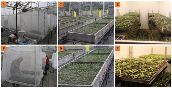 Locations of seedling grow-out experiments. (A,B) Seedlings grown in insect-proof netting cages in greenhouse #1. (C,D) Seedlings growing in open bench soil beds in greenhouse #2. (E,F) Seedlings growing in a growth chamber inside a headhouse.