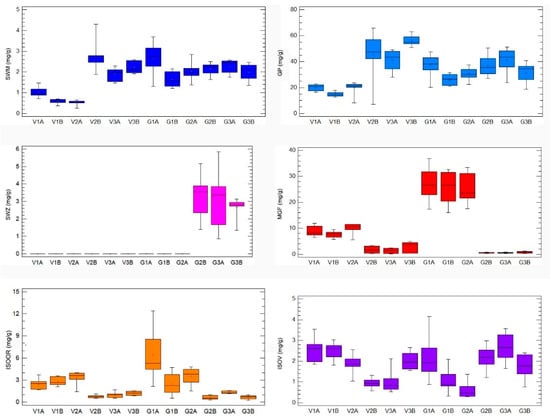 The contents of six representative secondary metabolites (mg/g dry weight (dw)) in Gentiana asclepiadea by 12 groups of samples (original, nontransformed data): Vlasina aboveground plant parts (V1A, V2A, V3A), Vlasina belowground plant parts (V1B, V2B, V3B), Golija aboveground plant parts (G1A, G2A, G3A), Golija belowground plant parts (G1B, G2B, G3B). Boxplot major features (bottom to top): minimum value, box (interquartile range), and maximum value. Horizontal bar inside a box is median. Cross inside a box is mean value. Vertical bar is range.