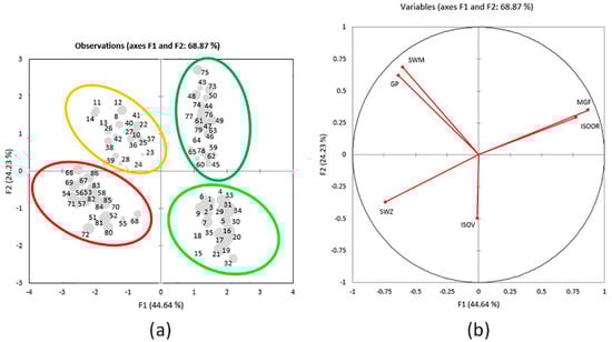 The separation of 86 elements by different plant parts is clear, as the aboveground plant parts are grouped on the right part of the figure (Golija top right and Vlasina bottom right) and the belowground plant parts are grouped on the left part (Vlasina top left and Golija bottom left) (Figure 4a). The red ellipse encompasses elements that contain SWZ, and these are belowground parts from populations G1, G2, and G3 (G1B, G2B, and G3B). The yellow ellipse encompasses elements with the higher content of SWM and GP and these are belowground part populations V1, V2, and V3 (V1B, V2B, and V3B) (the only exception is element nine, which is poorly represented in the plane of the first two axes). A dark-green ellipse encompasses elements with the higher content of MGF and ISOOR and these are aboveground parts from populations G1, G2, and G3 (G1A, G2A, and G3A). A light-green ellipse encompasses elements with the lower content of SWM and GP and these are aboveground parts from populations V1, V2, and V3 (V1A, V2A, and V3A).