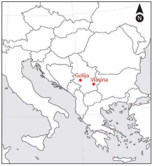 The positions of the Vlasina and Golija study sites are shown in Figure 5. Geographical coordinates of the studied populations and climate characteristics of locations are given in Table 3.