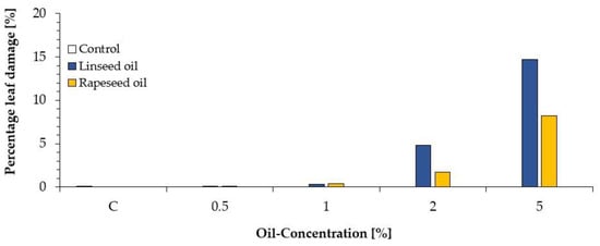 The phytotoxic effects were further evaluated with the “Image Analysis Software (Assess 2.0)” as shown in Figure 2. Up to an oil concentration of 1%, leaf damage was less than 0.5% and similar to that of control (water). At oil concentration of 2%, leaf damage was less than that for 5%. Only an oil concentration of 5% showed a percentage of leaf area damage of more than 8% for rapeseed oil and up to 14% for linseed oil (Figure 1 and Figure 2).