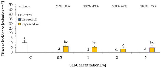 Northover and Timmer [42] (pp. 512–526) reported that so called “Horticultural Mineral Oils” and glyceride plant oils have a short protective activity of up to three days only. This finding could partly be confirmed by our results showing that shorter protective time intervals lead to a higher efficacy (Figure 5). However, it should be mentioned that the efficacy could vary depending on further experimental factors (e.g., cultivation, pathogen virulence), which cannot be controlled completely (Figure 5 and Figure 6).