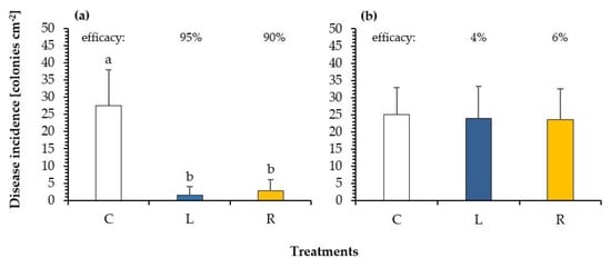 Disease incidence of bean rust (colonies cm−2 leaf) on (a) the half of primary leaves of Phaseolus vulgaris after a protective treatment (2dbi) with 2% drying linseed oil (blue) and 2% semi-drying rapeseed oil (yellow) in comparison to that of an untreated control (white) and (b) on the other non-treated half of the same leaves. Different letters above the columns indicate statistically significant differences at p < 0.05 according to the Games-Howell test. Percent values above represent the reduction of bean rust infestation in % in comparison to that of untreated control (according to Abbott [41]). n = 5.