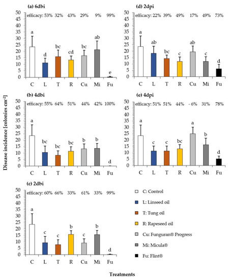 In the next set of experiments, protective and curative control of the pathogen was tested in more detail, because the knowledge on timing of application is prerequisite for a successful implementation in plant protection strategies. Prolonged time intervals (days) of a single application before inoculation (6dbi, 4dbi, and 2dbi for protective control) and past inoculation (2dpi and 4dpi for curative control) were used. Furthermore, we included tung oil in these experiments as a drying oil featuring a different fatty acid composition (see Table 1), to support our idea that the fungicidal effect depends on the type of oil, its drying category, and its fatty acid composition. The single plant oil preparations (L, T, R) were compared to three commercial products (Cu, Mi, and Fu, see Section 4.3.3, Table 2 for explanation). The disease incidence (Figure 5a–e) in untreated control was comparable for all time intervals tested. All treatments showed a protective efficacy ranging from 9% (Cu, 6dbi, Figure 5a) to 100% (Fu, 4dbi, Figure 5b). While the single oils showed a protective (Figure 5a–c) inhibitory effect ranging from 32% (T, 6dbi, Figure 5a) to 66% (T, 2dbi, Figure 5c), the highest disease reduction was observed for Fu (99–100%). For the drying plant oils, efficacy increased from 6dbi to 2dbi. L ranged from 53% to 60% and T ranged from 32% to 66% (Figure 5a,c). Shorter time intervals between protective application and inoculation with the pathogen resulted in higher protection. The curative efficacy (Figure 5d,e) of the treatments was lower in comparison to that of the protective application. The highest and statistically significant disease reduction was observed for Fu with 78% (Figure 5e). All other treatments showed an inhibitory efficacy ranging from 6% (Cu, 4dpi, Figure 5e) to 51% (L and T, 4dpi, Figure 5e). Drying plant oils and Fu showed a higher inhibitory efficacy for 4dpi (Figure 5e) than 2dpi (Figure 5d) and resulted in a statistically significant difference in comparison to that of the untreated control, while R, Cu, and Mi showed a lower effect for 4dpi.