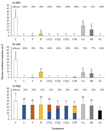 Disease incidence of bean rust colonies cm−² on leaves of Phaseolus vulgaris after (a) protective application of 2dbi, (b) 1dbi, and (c) curative application of 2dpi of three single oils (L, T, and R), four oil mixtures (LT(1)—50:50, LT(2)—80:20, LT(3)—95:5, and LTR—47.5:5.0:47:5), and three commercial products (Cu, Mi, and Fu) in comparison to that of untreated control (C). Used concentrations: 2% for all tested oil combinations; Cu (537 g/kg Cu(OH)2), Mi (85% emulsified rapeseed oil); Fu (500 g/kg Trifloxystrobin). Different letters above indicate mean values significantly different at p ≤ 0.05 according to the Games-Howell test. Numbers above represent the inhibitory efficacy on bean rust infestation in % in relation to untreated control (according to Abbott [41]). n = 5.
