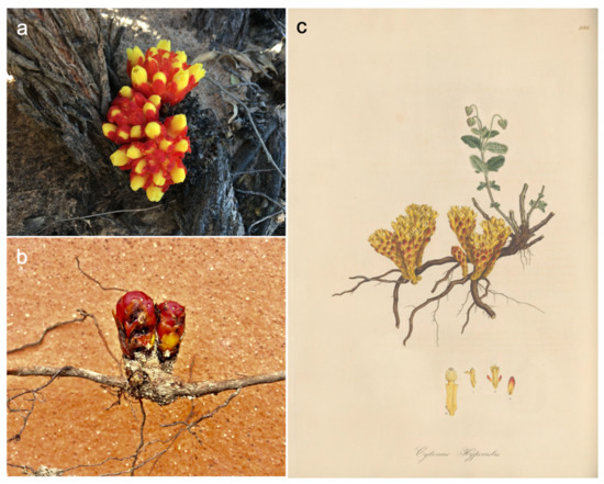 (a) Cytinus hypocistis partially opened inflorescences, at the basis of a Halimium halimifolium’s stem, Sardinia, April 2017, author: A.C. Rinaldi; (b) C. hypocistis emerging directly from a Cistus salviifolius’ root, Sardinia, March 2016, author: A.C. Rinaldi; (c) a classic drawing of C. hypocistis [21].