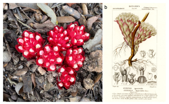 (a) Cytinus ruber inflorescences, Sardinia, April 2016, author: A.C. Rinaldi; (b) an 1847 drawing of C. ruber, clearly identifiable by its bright red and white flowers, from [22]. To note the misbranding as C. hypocistis: indeed, it was not until 1922 that C. ruber was described as a separate species.