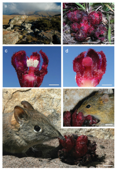 Habitat, morphology and pollinators of Cytinus visseri: (a) habitat on the summit of the Long Tom Pass, South Africa; (b) male inflorescence. Scale bar, 10 mm; (c) cross section of male flower. The nectar chamber is well visible underneath the androecium. Scale bar, 5 mm; (d) cross section of female flower. Scale bar, 5 mm; (e) a short-snouted elephant shrew Elephantulus brachyrhynchus feeding on nectar in C. visseri flowers. The tongue entering the flower is visible below the snout. Scale bar, 10 mm; (f) a striped field mouse Rhabdomys pumilio feeding on nectar in male C. visseri flowers. Scale bar, 10 mm. From [43]. Reproduced with permission.