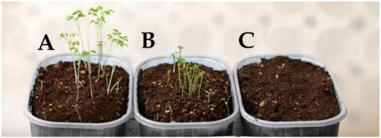 Effect of Dittrichia viscosa dried biomass (DB) on the emergence of Lepidium sativum, 16 days after sowing. (A) control (D0 treatment = no DB added to the soil); (B) D10 treatment (10 kg DB m−3 of soil); (C) D40 treatment (40 kg DB m−3 of soil).