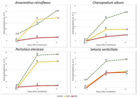 In the course of the open field experiment, four species emerged, all typical of the period (May-June), i.e.: A. retroflexus L. (redroot pigweed), C. album (common lambsquarters), P. oleracea L. (common purslane), Setaria verticillata (Vill.) L. (hooked bristlegrass). The quite small size of the plots resulted in a rather uniform infestation. With respect to the control, 11 DAT the emergence of A. retroflexus and P. oleracea was significantly lower both in D10 and in D30. Conversely, 19 and 24 DAT, only in D30 plots was the emergence lower than in the D0 (Figure 2 and Figure 3). The number of the emerged plants of C. album was statistically lower in treated plots than in the control at all times. Concerning S. verticillata, the number of emerged plants was lower in D10 and D30 than in D0 only 11 DAT; in the other surveys, although fewer plants emerged in the treated plots, differences were not significant. At the end of the experiment (24 DAT) the total aerial F.W. in the treated plots (0.18 and 0.11 kg m−2, D10 and D30, respectively) was much less than in the control (0.7 kg m−2).