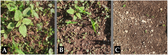 Effect of Dittrichia viscosa dried biomass (DB) on the emergence of natural seed bank in the field experiment, 19 days after treatment. (A) control (D0 treatment = no DB added to the soil); (B) D10 treatment (10 kg DB m−3 of soil for a layer of 0.04 m); (C) D30 treatment (30 kg DB m−3 of soil for a layer of 0.04 m).