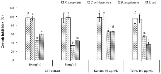 Antibacterial activity of the leathery exocarp (LEP) extract. Bars with different letters indicate mean values significantly different at p < 0.05, according to a one-way ANOVA combined with Tukey’s B post-hoc test. Data are expressed as the mean of three replicates ± SD.