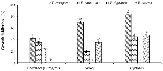 Antifungal activity of the LEP extract. Bars with different letters indicate mean values significantly different at p < 0.05, according to a one-way ANOVA combined with Tukey’s post-hoc test. Data are expressed as the mean of three replicates ± SD.