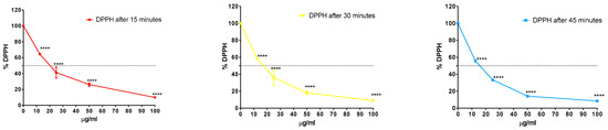 The antioxidant activity of the LEP extract was assessed by the 2,2-diphenyl-1-picrylhydrazyl (DPPH) assay. The inhibition of DPPH was dose- and time-dependent, as shown in Figure 3. The IC50 values ranged between 19.77 µg/mL after 15 min and 14.74 µg/mL after 45 min of exposure. These results were comparable to the antioxidant reference “vitamin C” (1.95 µg/mL after 45 min).