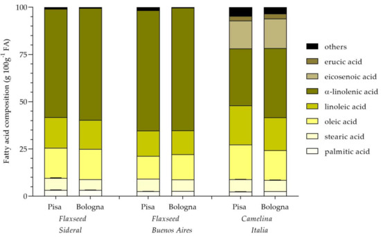 In Figure 2, the fatty acid composition of flaxseed and camelina seeds has been shown. Data highlighted that, for both flaxseed varieties, fatty acid composition did not vary depending on the cultivation site, while differences were observed between the two cultivars. In particular, Buenos Aires seeds were characterized by a lower content of linoleic acid and a higher content of α-linolenic one, in comparison with Sideral. On the contrary, for camelina, the cultivation site seemed to have a significant effect on the acidic composition, with higher contents of oleic and linoleic acids and a lower amount of α-linolenic acid in seeds obtained from the Pisa crop, compared with the fatty acid profile of camelina seed obtained in Bologna.