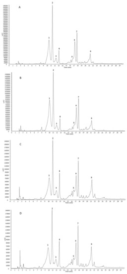 HPLC–PDA/UV profiles (detected at 280 nm) of secoisolariciresinol diglucoside (SDG) oligomers alkaline hydrolysates from the defatted seed meal extracts of flaxseed Sideral cultivated in Bologna (A) and Pisa (B), and Buenos Aires cultivated in Bologna (C) and Pisa (D). For peak data, see Table 3.