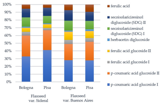 Percentage amount of identified phenols in secoisolariciresinol diglucoside (SDG) oligomers after the alkaline hydrolysis of flaxseed meal extracts from Sideral and Buenos Aires in two Italian cultivation sites, Pisa and Bologna.