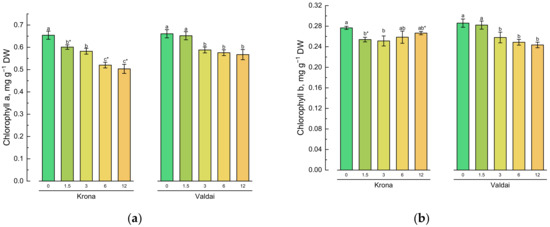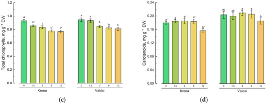 Oil contamination of the soil led to significant decrease in contents of chlorophyll a, chlorophyll b and total chlorophylls in Krona shoots even at low concentrations (1.5%). The Valdai variety demonstrated significant changes at oil concentrations equal to 3% or more (Figure 1a–c). The decrease in contents of chlorophyll a and total chlorophylls in conditions of soil pollution with crude oil was more significant in Krona plants than in Valdai plants (Figure 1a,c).