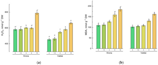 Contents of hydrogen peroxide content and malondialdehyde, which are the products of lipid peroxidation, were used to determine induction of oxidative stress resulted from soil oil pollution. Hydrogen peroxide content in rye shoots depended on the oil concentration in the soil and rye variety (Figure 2a; Appendix A, Table A1). A significantly higher level of H2O2 was recorded only at the maximum oil concentration (12%) in the Krona variety. Hydrogen peroxide content in Valdai plants was lower than in Krona plants. However, essential changes in its content in comparison with the control were recorded at 3% oil concentration in the soil (Figure 2a).
