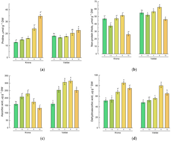 Non-protein thiols content was determined using 5,5′-dithiobis- (2-nitrobenzoic acid) as described in [63]. The plant material (1 g) was homogenized in 10 mL of 5% sulfosalicylic acid. The homogenate was centrifuged at 20,000× g for 20 min. The reaction mixture contained supernatant, 0.1 M sodium phosphate buffer (pH 7.0), 0.5 mM EDTA, and 0.25 mM 5,5′-dithiobis- (2-nitrobenzoic acid). The mixture was incubated for 10 min at room temperature. Optical absorbance was measured at 412 nm. Non-protein thiols content was determined using a calibration graph. Glutathione was used as a standard. Non-protein thiols content in plants was expressed in μmoles per g dry weight.