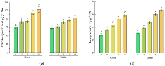 A sharp increase in the content of ascorbate was detected at minor oil concentrations in the soil (1.5 and 3%) in Krona shoots, and at all studied oil concentrations in Valdai shoots in comparison with the control (Figure 3c). Contents of dehydroascorbic acid (DHA) and 2,3-diketogulonic acid (DKGA) in rye shoots were about 3 times less than content of ascorbic acid (Figure 3d,e). The highest DHA content for both rye varieties was observed at 6% oil concentration in the soil. DKGA content increased with the increase in oil concentration in the soil and was maximal at the maximum pollution level.