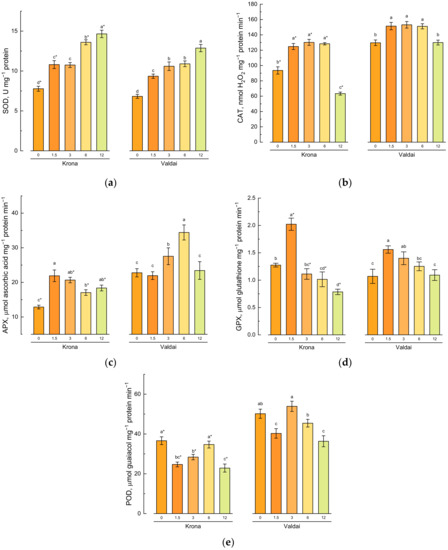 Changes in ascorbate peroxidase (APX) activity depending on the oil concentration in the soil differed in shoots of different varieties (Figure 4c). Thus, ascorbate peroxidase activity in Krona plants grown on the oil-polluted soil was significantly higher than that of the control. Compared to the control, a higher ascorbate peroxidase activity was detected in Valdai plants grown only on the soil having 3% and 6% oil concentrations.