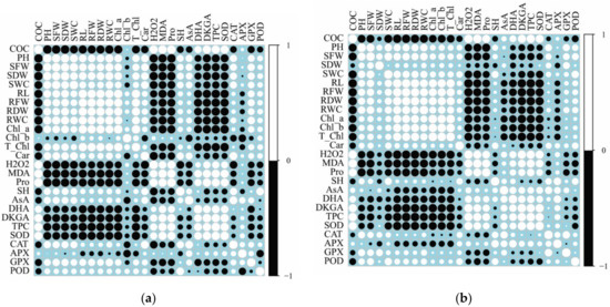 Pearson correlation plots for the studied growth parameters (COC—crude oil concentration in soil, PH—plant height, SFW—shoot fresh weight, SDW—shoot dry weight, SWC—shoot water content, RL—root length, RFW—root fresh weight, RDW—root dried weight, RWC—root water content), biochemical (Chl_a—chlorophyll a, Chl_b—chlorophyll b, T_Chl—total chlorophylls, Car—carotenoid, MDA—malondialdehyde, H2O2—hydrogen peroxide, Pro–proline, SH–non-protein thiols, AsA–ascorbic acid, DHA–dehydroascorbic acid, DKGA–2,3-diketogulonic acid, and TPC–total phenolic compounds), and enzymatic parameters (SOD–superoxide dismutase, CAT–catalase, APX–ascorbate peroxidase, GPX–glutathione peroxidase, POD–peroxidase) of Krona variety (a) and Valdai variety (b).