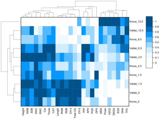 Distribution of plant samples into clusters primarily depended on the oil concentration in the soil rather than rye variety (Figure 6, at the left). The first cluster included control plants of both varieties and Valdai plants at 1.5% oil concentration in the soil. The second cluster included Krona plants at 1.5% and 3% oil concentrations. The third cluster included Valdai plants at 3% and 6% concentrations. The fourth cluster included Krona plants at 6% oil concentration and Valdai plants at 12% oil concentration. A separate cluster was formed by Krona plants grown at 12% oil concentration in the soil. These plants were characterized by minimal or very low parameter values of growth, chlorophylls content, carotenoids content, ascorbic acid content, non-protein thiols content, activities of CAT, APX, POD, and GPX, as well as high values of malondialdehyde content, hydrogen peroxide content, oxidized forms of ascorbic acid (dehydroascorbic and 2,3-diketogulonic acids) content, phenolic compounds content, and superoxide dismutase activity.