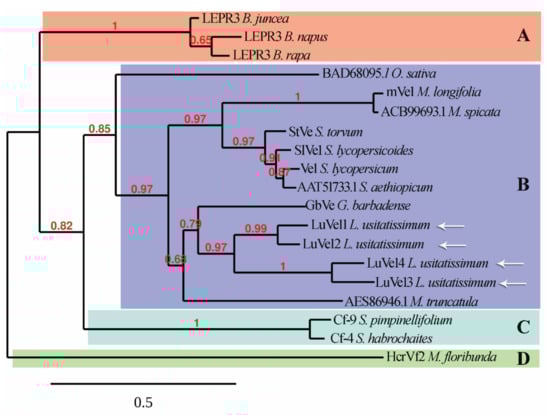 Phylogram showing evolutionary relationships between resistance receptor-like proteins (RLPs) in plants including candidate proteins in flax (arrows), determined by using the maximum-likelihood method. Branch lengths are proportional to evolutionary distances, branch values > 0.6 are given at the node to indicate the branch support. A indicates a Leptosphaeria maculans resistance RLPs cluster, B is relative to a Verticillium spp. race 1 resistance cluster, C to a Cladosporium fulvum cluster and cluster D to Venturia inaequalis resistance RLPs. Amino acids alignment is showed in Supplementary Materials, Figure S1.