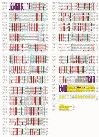 A predictive analysis of Ve1 and the four flax proteins reveals that all sequences are comprised of a N-terminus peptide signal, a large non-cytosolic segment, a transmembrane segment and a small cytosolic segment in C-terminus except for LuVe14 which is comprised of a second transmembrane segment and a cytosolic segment in C-terminus (Supplementary Materials, Table S1). Furthermore, the five domains A-E according to [] were investigated through a sequence alignment (Figure 2). Domain A matched a signal peptide, which was comprised of hydrophobic amino acids and a copy of a leucine zipper-like motif LX(6)LX(6)LX(6)L and was only found on Ve1. Domain B was an extracellular LRR containing 37 imperfect copies (B1 to B38, except for B32) of a 28 amino acids consensus motif [XXIXNLXXLXXLXLSXNXLSGXIP] and a non LRR segment (B32). LuVe11 contained 36 imperfect copies of the consensus motif (not B23), LuVe14 contained 34 copies (not B27, B28 and B29), and LuVe12 and LuVe13 contained 37 copies. This domain also included 28 N-glycosylation sites identified by the NX[ST] motif. Likewise, 27 potential N-glycosylation sites were found on LuVe11, 28 on LuVe14 and 23 on LuVe12 and LuVe13; several sites were in common and were conserved. A copy of the leucine zipper-like motif was identified in LuVe11 and LuVe13 in domain B. The following elements were present in all homologs: an extracytosolic and negatively charged in domain C, a transmembrane segment formed by hydrophobic amino acids in domain D, and in C-terminus, a cytosolic and positively charged in domain E and a copy of the mammal-specific endocytosis signal [ED]XXXφ or YXXφ, where φ stands for hydrophobic amino acid. A membrane-associated domain within domain E and hydrophobic amino acids were only found in LuVe14.