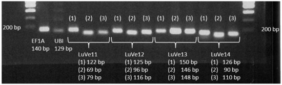 PCR amplifications of EF1A, UBI2, LuVe11 (performed by 3 primer pairs), LuVe12 (performed by 3 primer pairs), LuVe13 (performed by 3 primer pairs), LuVe14 (performed by 3 primer pairs) on cv. Adélie genomic DNA. The respective size of each amplicon is mentioned below.