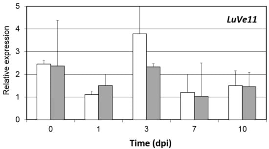 Real-time PCR of a time course of LuVe11 expression in cv. Télïos (white bars) and cv. Adélie (grey bars) in root tissues. Bar represent relative levels of LuVe11 transcripts to the transcript levels of flax EF1A and UBI2 (for normalization) with the SD of a sample of three pooled plants. Dpi, days post inoculation.