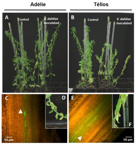 Pathogenicity test performed on two fiber flax cultivars using GFP-tagged V. dahliae race 1 strain. Wilting symptoms observed on cv. Adélie ((A) and (D), for detailed wilting symptoms on leaves) and cv. Télïos ((B) and (F), for detailed wilting symptoms on leaves) four weeks post inoculation. Debut of acropetal colonization in infected plant stems, cv. Adélie (C) and in cv. Télïos (E) at four weeks post inoculation. White arrow shows V. dahliae hyphae.